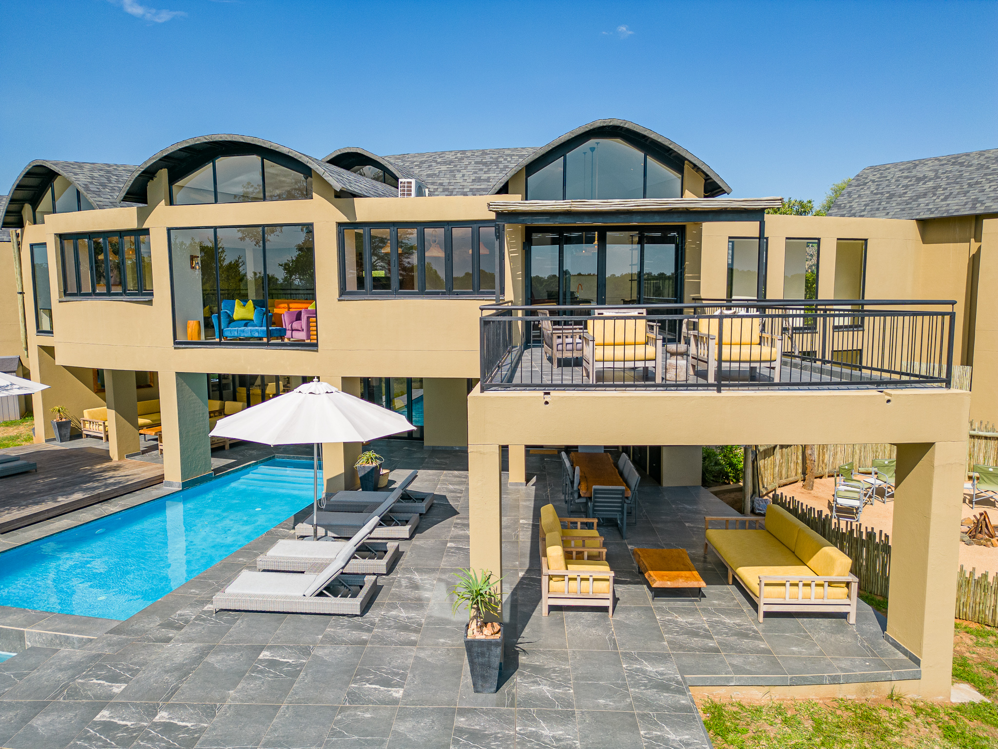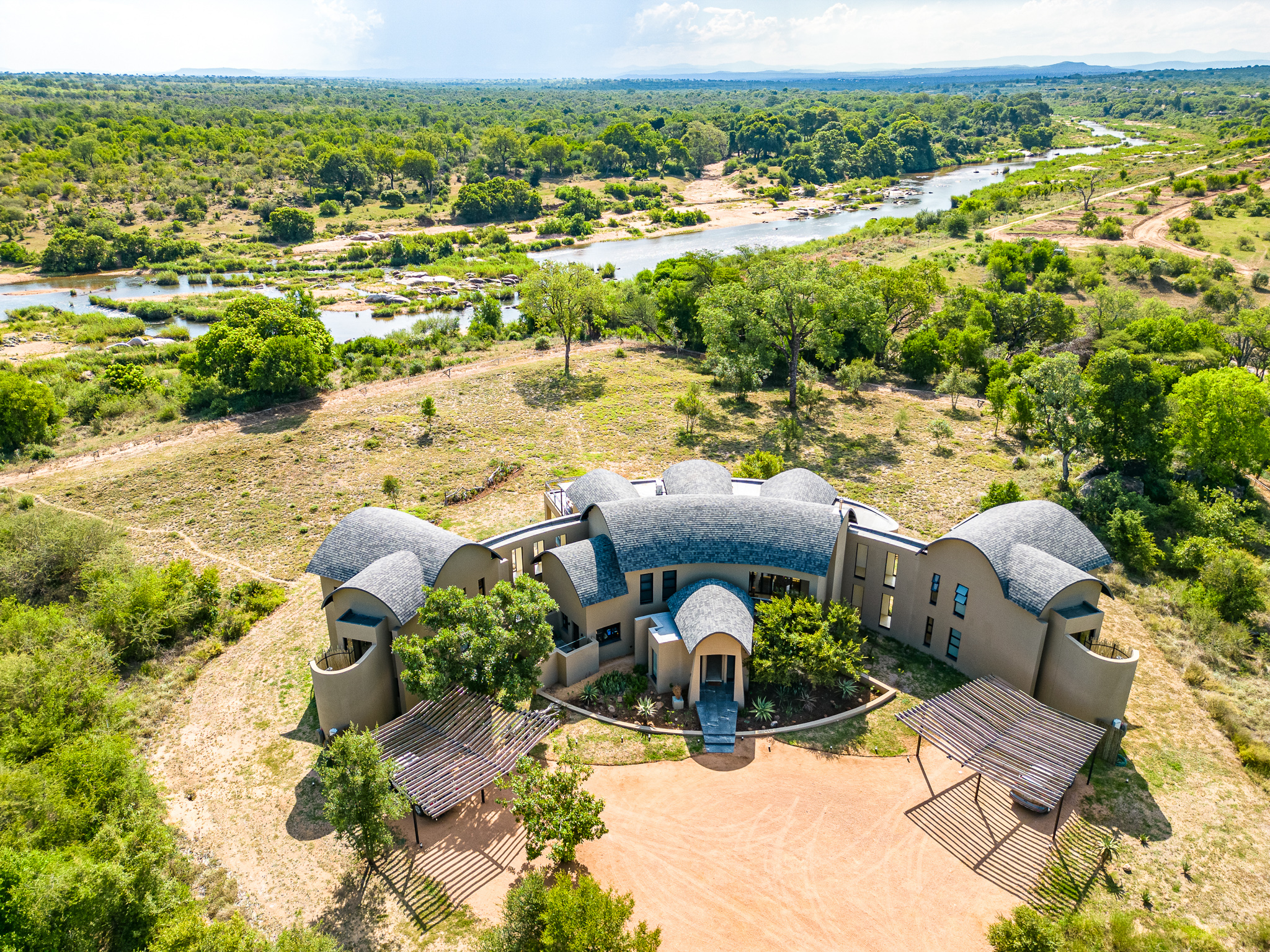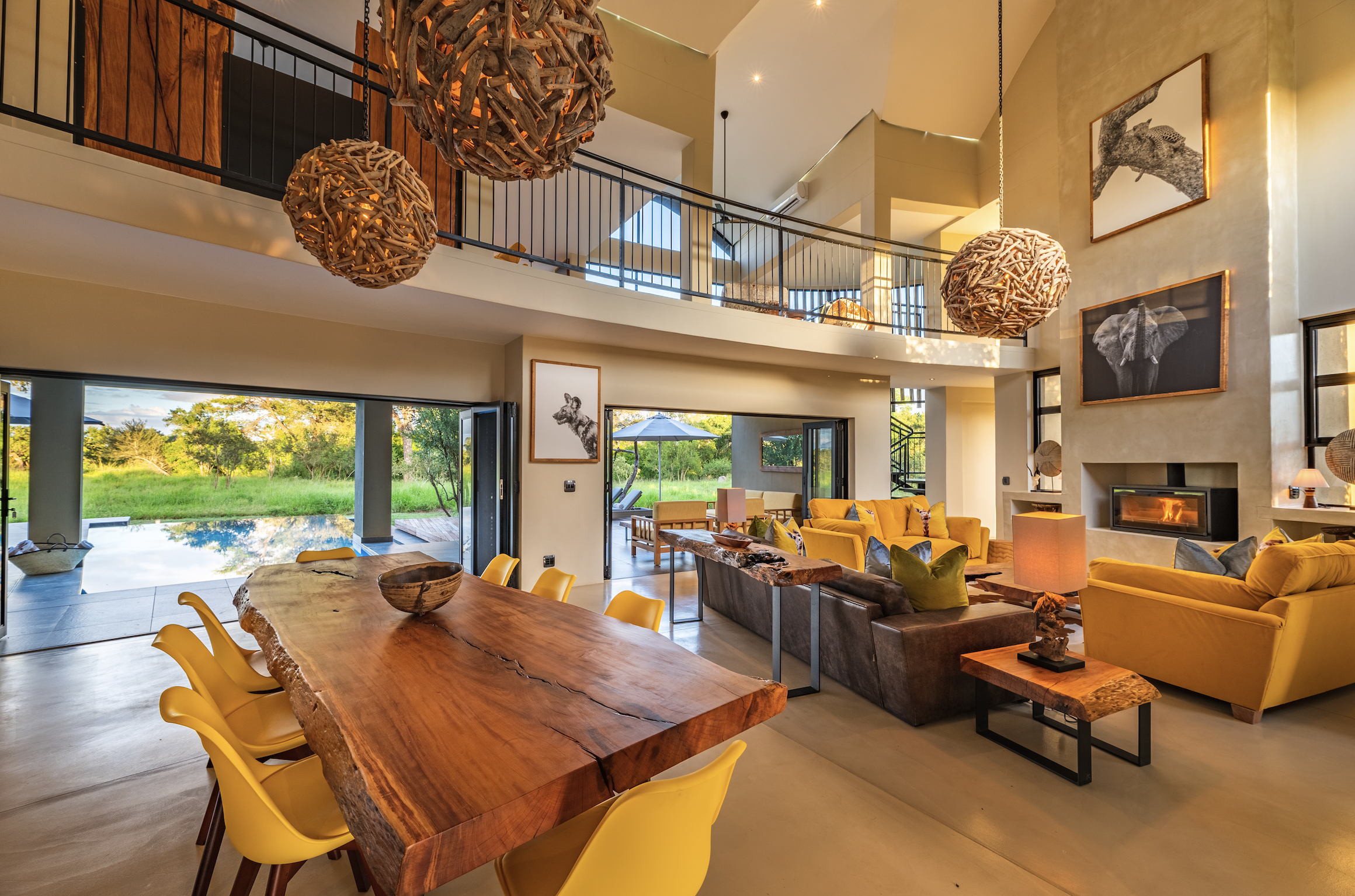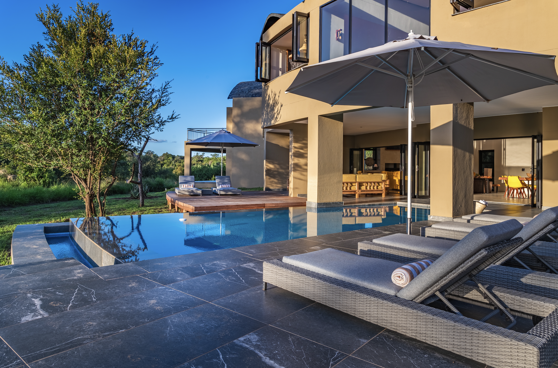 Located on the banks of the stunning Sabie River, with views directly over the river and into the Kruger National Park in South Africa, the newly built Nkova Sabie is a family villa that accommodates up to 10 people and provides luxury holiday accommodation for the discerning guest who is looking for comfort in an elegant, tasteful, relaxing environment. This uniquely designed, beautifully spacious self-catered villa has embraced sustainability and recycling in its build, and has been impeccably furnished to give a contemporary feel. Nkova Sabie is located in a secure and private game reserve called Elephant Point and is located 7 minutes from the entrance gate into the Kruger National Park via the Paul Kruger gate. It boasts a new back-up generator which gives you the peace of mind that you will have electricity throughout the villa 24/7. The villa also has access to private chef services and a restaurant overlooking the river (which also does great take aways and hampers!)