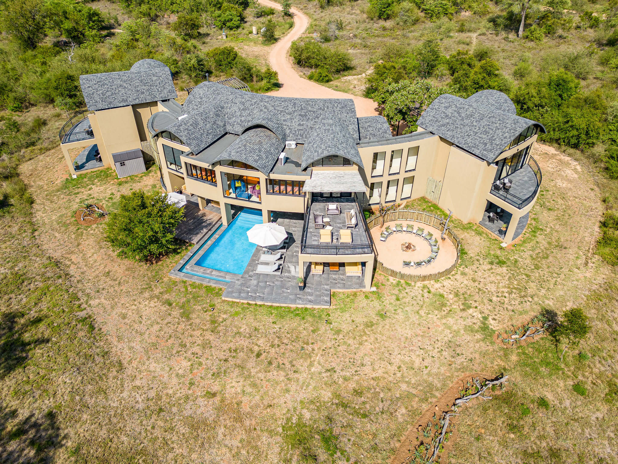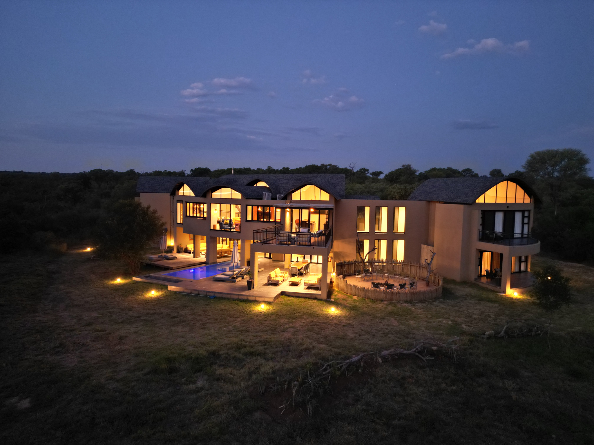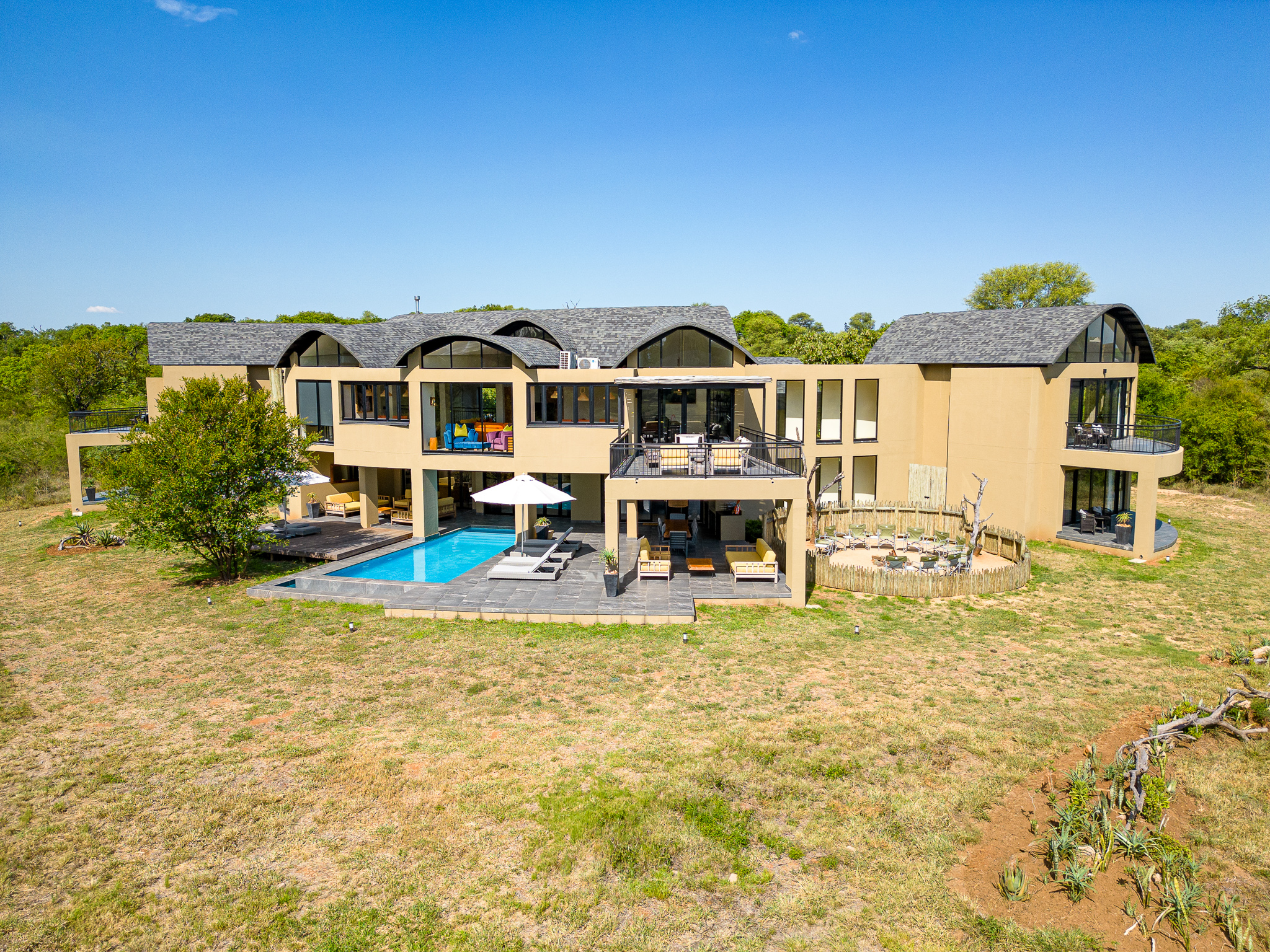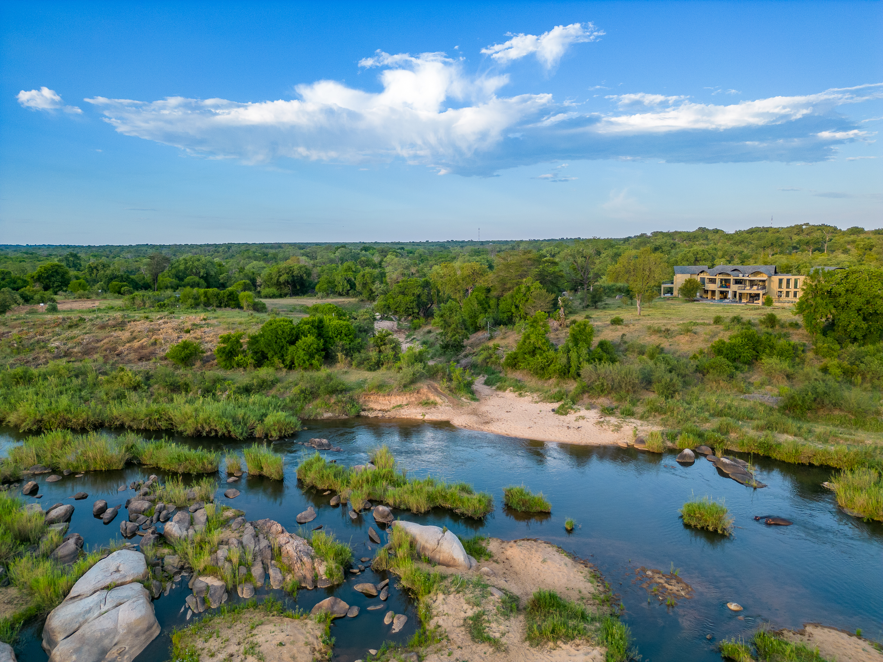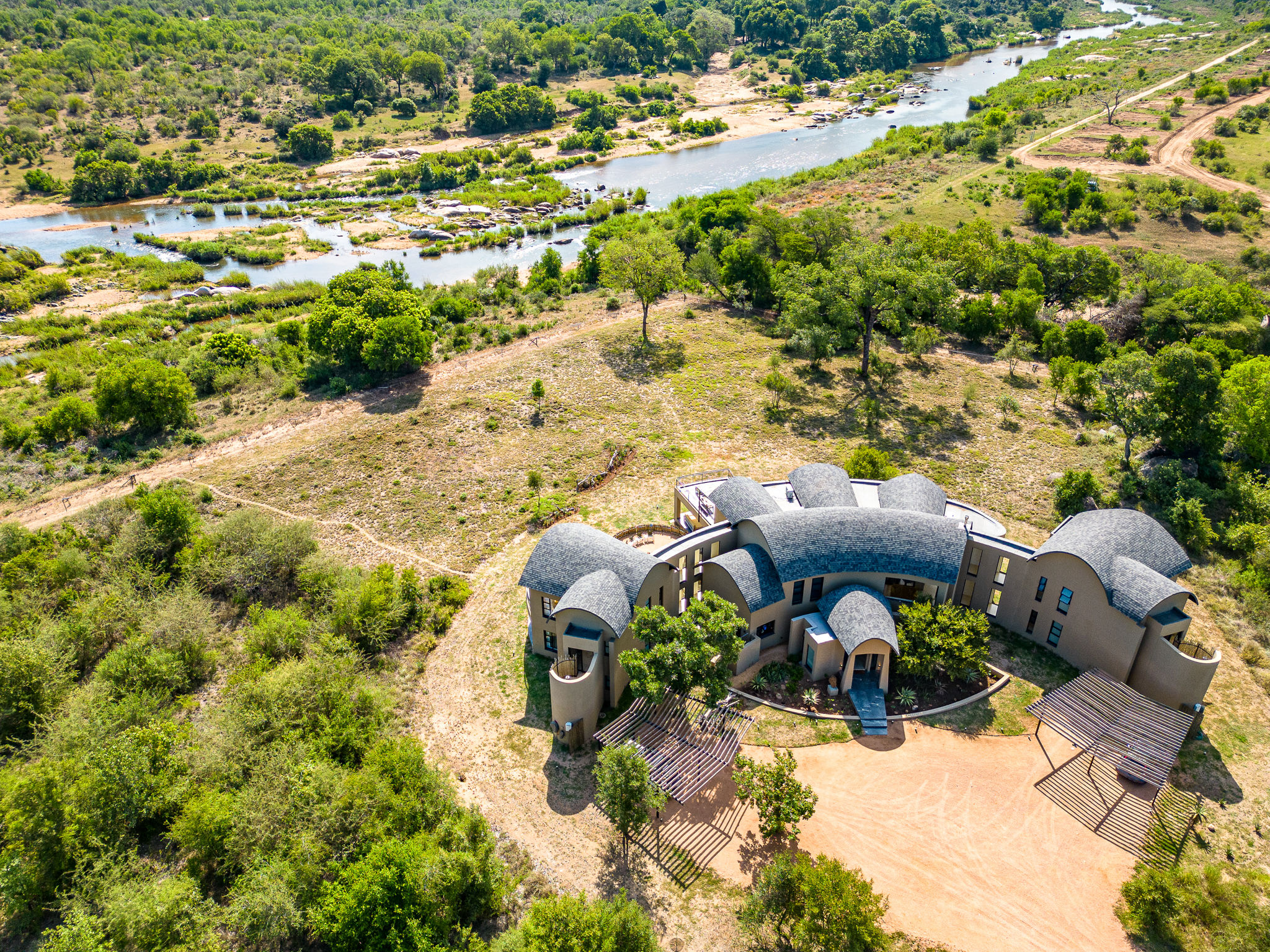 Located on the banks of the stunning Sabie River, with views directly over the river and into the Kruger National Park in South Africa, the newly built Nkova Sabie is a family villa that accommodates up to 10 people and provides luxury holiday accommodation for the discerning guest who is looking for comfort in an elegant, tasteful, relaxing environment. This uniquely designed, beautifully spacious self-catered villa has embraced sustainability and recycling in its build, and has been impeccably furnished to give a contemporary feel. Nkova Sabie is located in a secure and private game reserve called Elephant Point and is located 7 minutes from the entrance gate into the Kruger National Park via the Paul Kruger gate. It boasts a new back-up generator which gives you the peace of mind that you will have electricity throughout the villa 24/7. The villa also has access to private chef services and a restaurant overlooking the river (which also does great take aways and hampers!)
