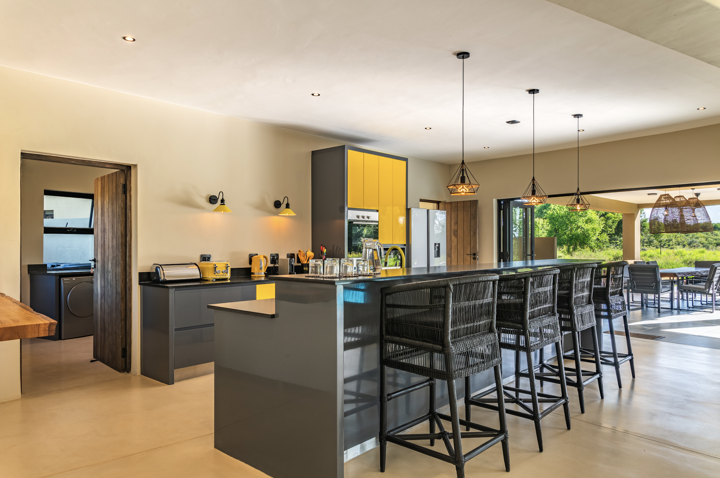 - A fully equipped modern kitchen with black Zimbabwean granite worktops and breakfast bar with easy-to-use appliances, and the added benefit of a separate, spacious scullery/utility room: